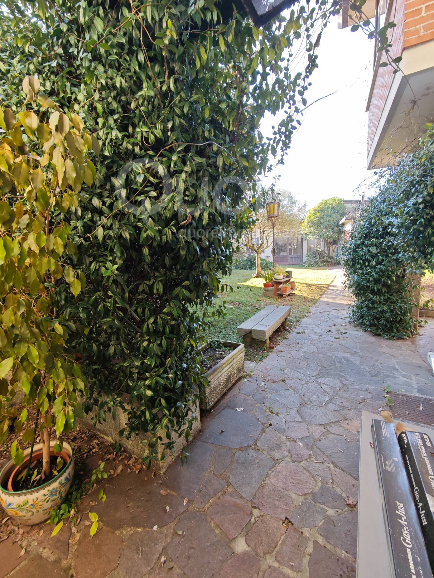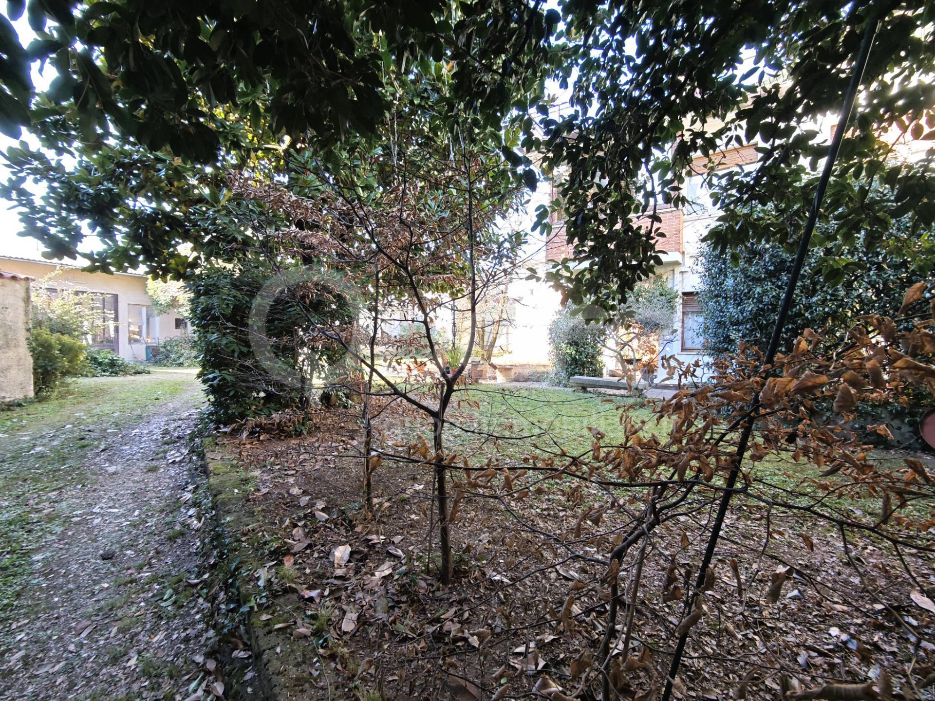 In posizione centrale, casa in linea su tre piani con giardino interno di 360 mq e due ampie pertinenze uso deposito/autorimessa e stanza conviviale. L’immobile principale si distribuisce su tre piani. Attualmente al piano terra troviamo uno spazioso ingresso da cui si accede alla zona giorno composta da cucina abitabile, ampio soggiorno e bagno, entrambi con affaccio sul verde privato; quattro camere, ampio studio e doppi servizi al primo piano; open space e bagno/lavanderia, oltre a terrazza di 78 mq al piano soffitta; cantina e c.t. al piano interrato. Il tetto, rifatto, è in ottimo stato e si presenta con travi a vista. Il giardino, accogliente e riservato, è circondato dal corpo principale e dalle due pertinenze indipendenti. La casa si presenta in ottimo stato manutentivo, essendo stata oggetto di diversi lavori nel corso degli anni, è tuttora abitata e offre ambienti ampi, luminosi e ben distribuiti. La cubatura si presta anche ad eventuali suddivisioni in più unità abitative.