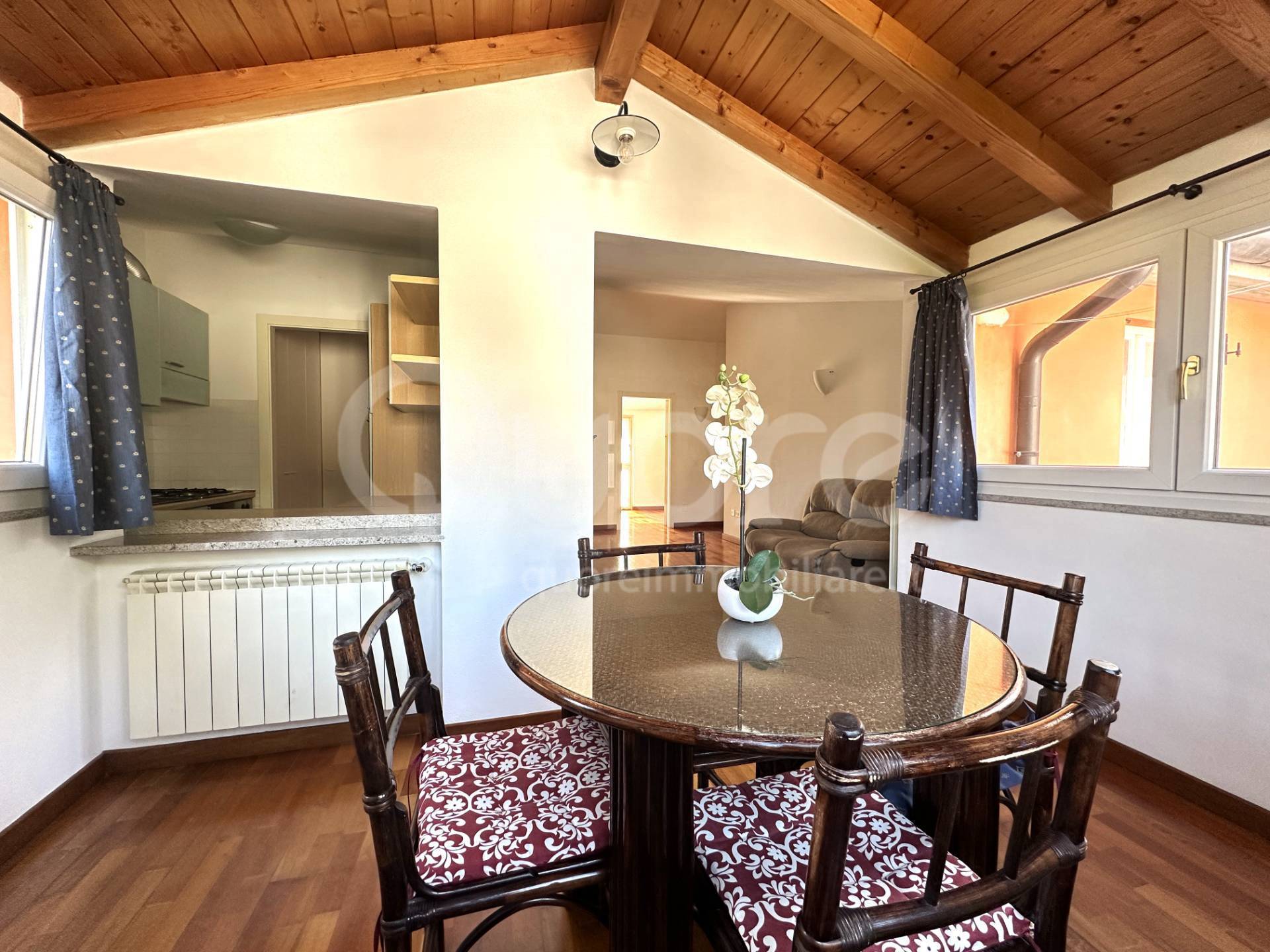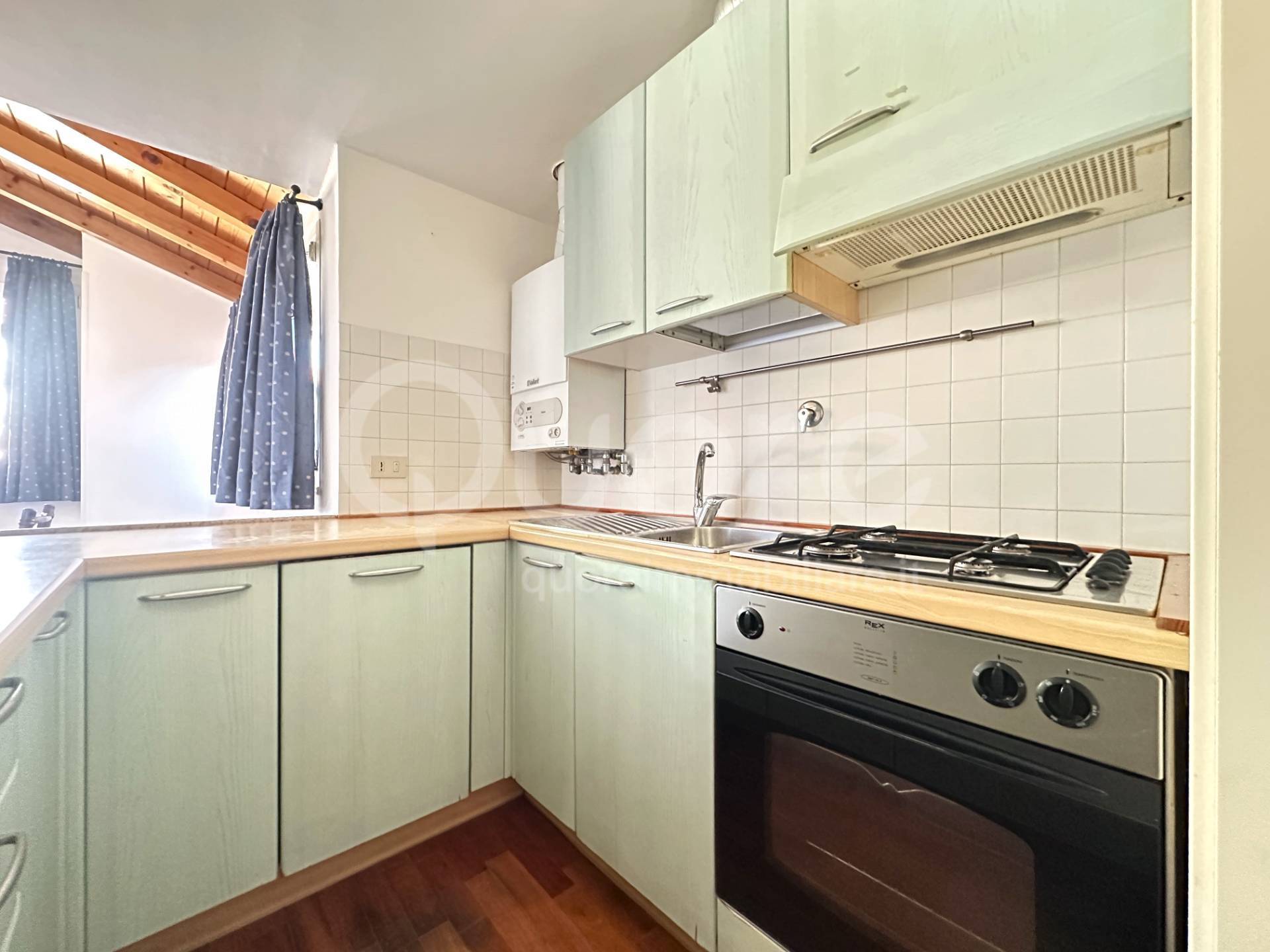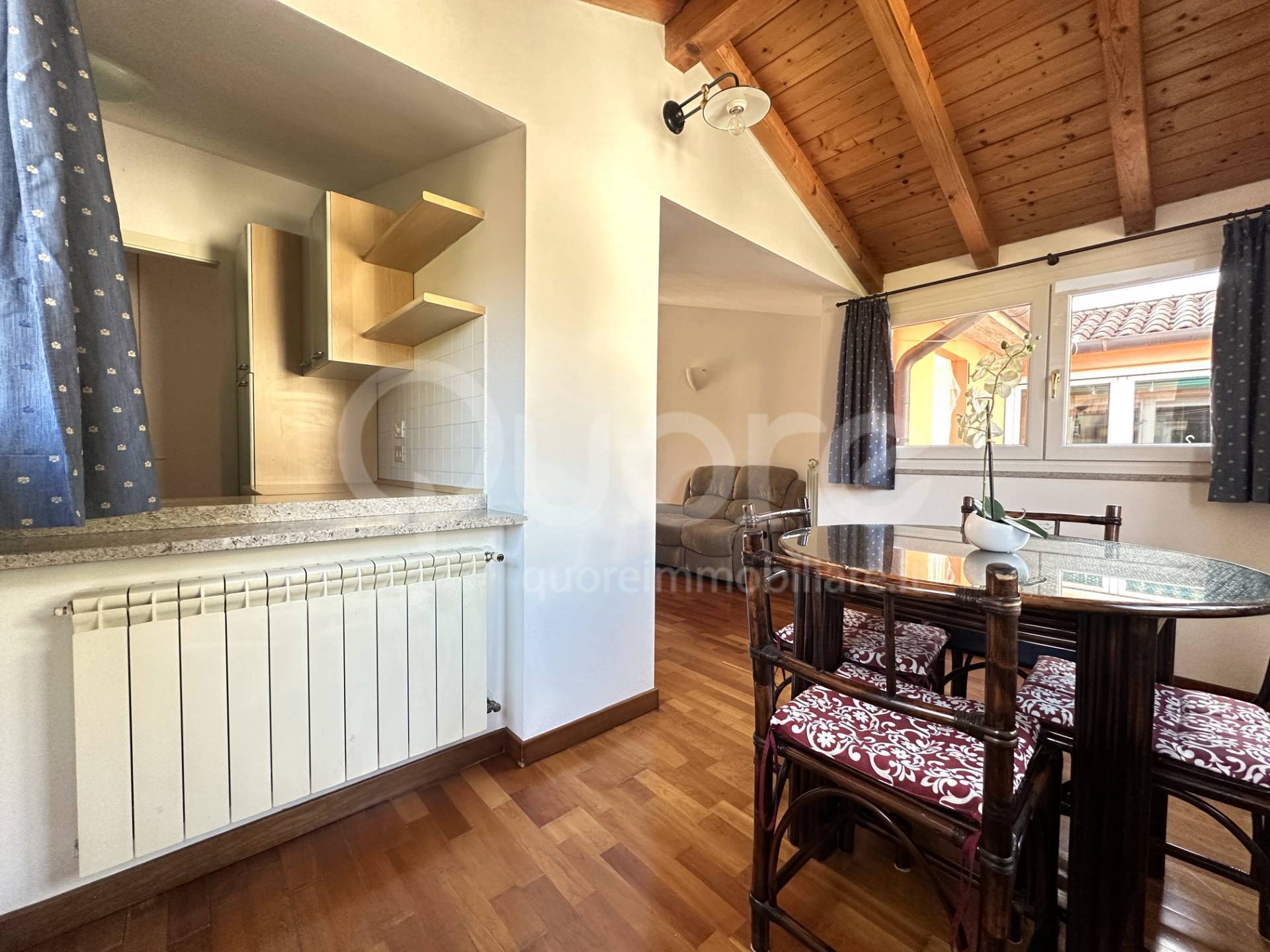 La cucina, separata e funzionale, è dotata di un ampio piano di lavoro e si affaccia sulla zona giorno, rendendo l’ambiente pratico e al tempo stesso caldo e accogliente.