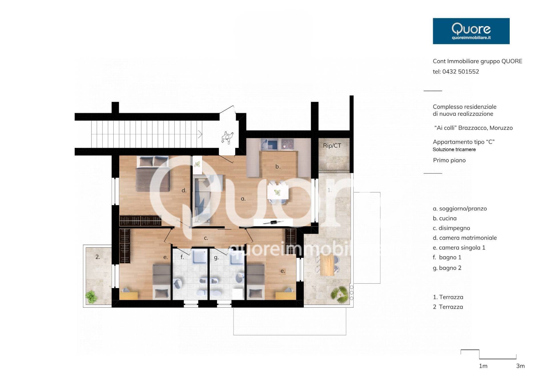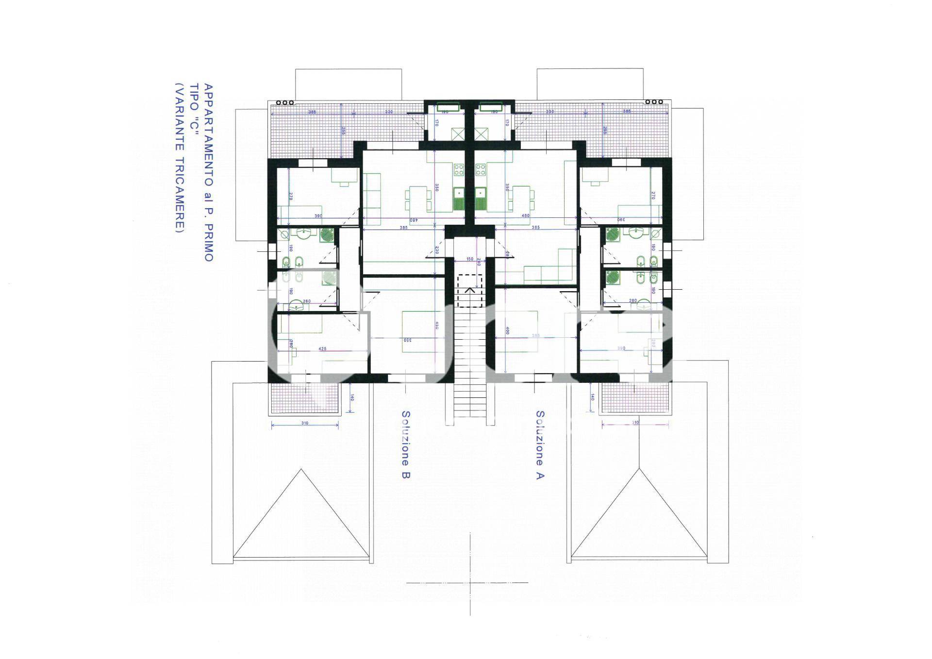 Il tricamere al primo piano ha un ingresso con soggiorno e angolo cucina con uscita su ampia terrazza abitabile , zona notte composta da matrimoniale, due singole e due bagni,