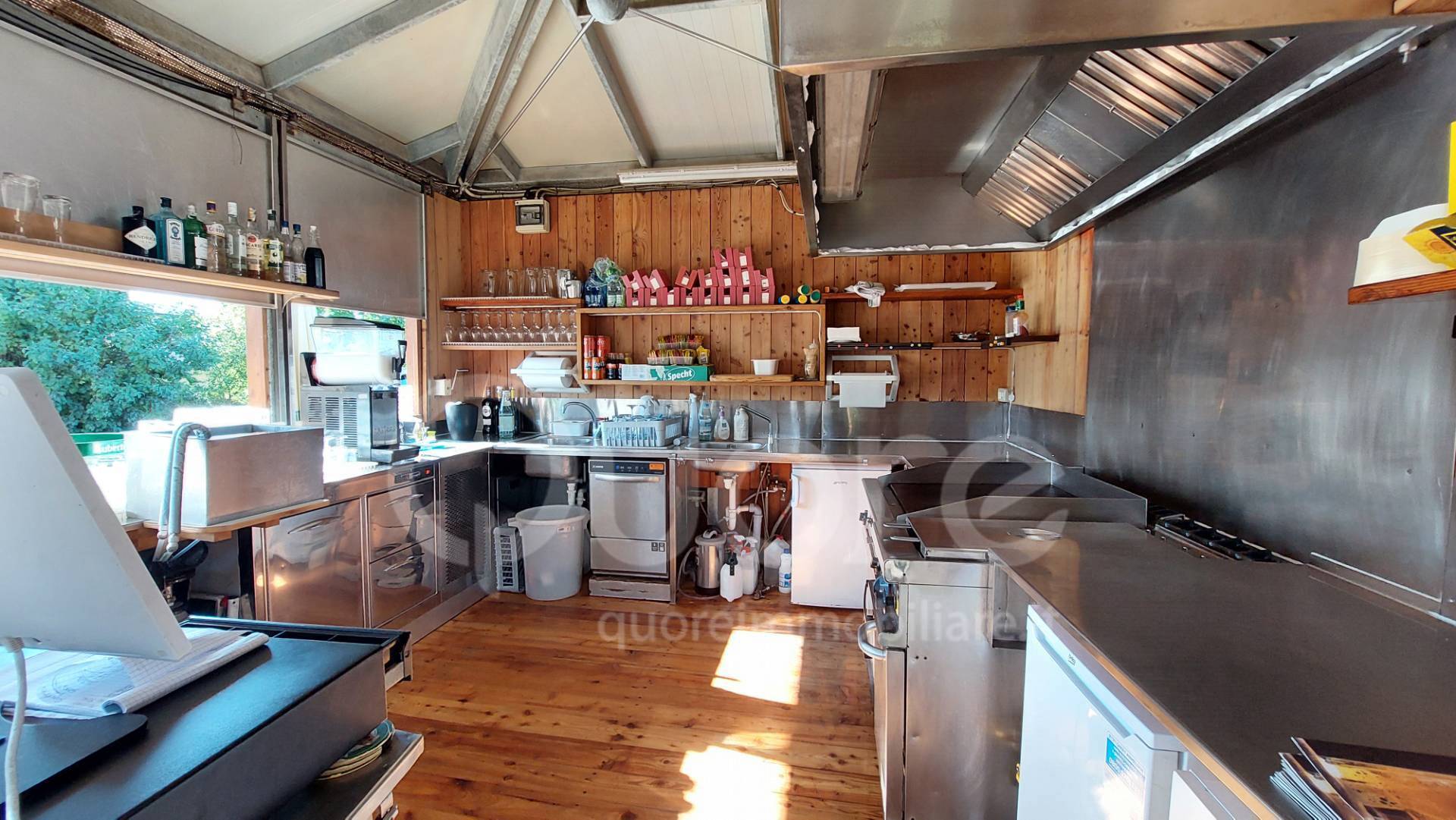 All’esterno, il bar dispone di un ampio portico e un gazebo arredato ed equipaggiato, con una cucina ben organizzata e 22 tavoli in legno con panche e ombrelloni, tende da sole elettriche e separé laterali.