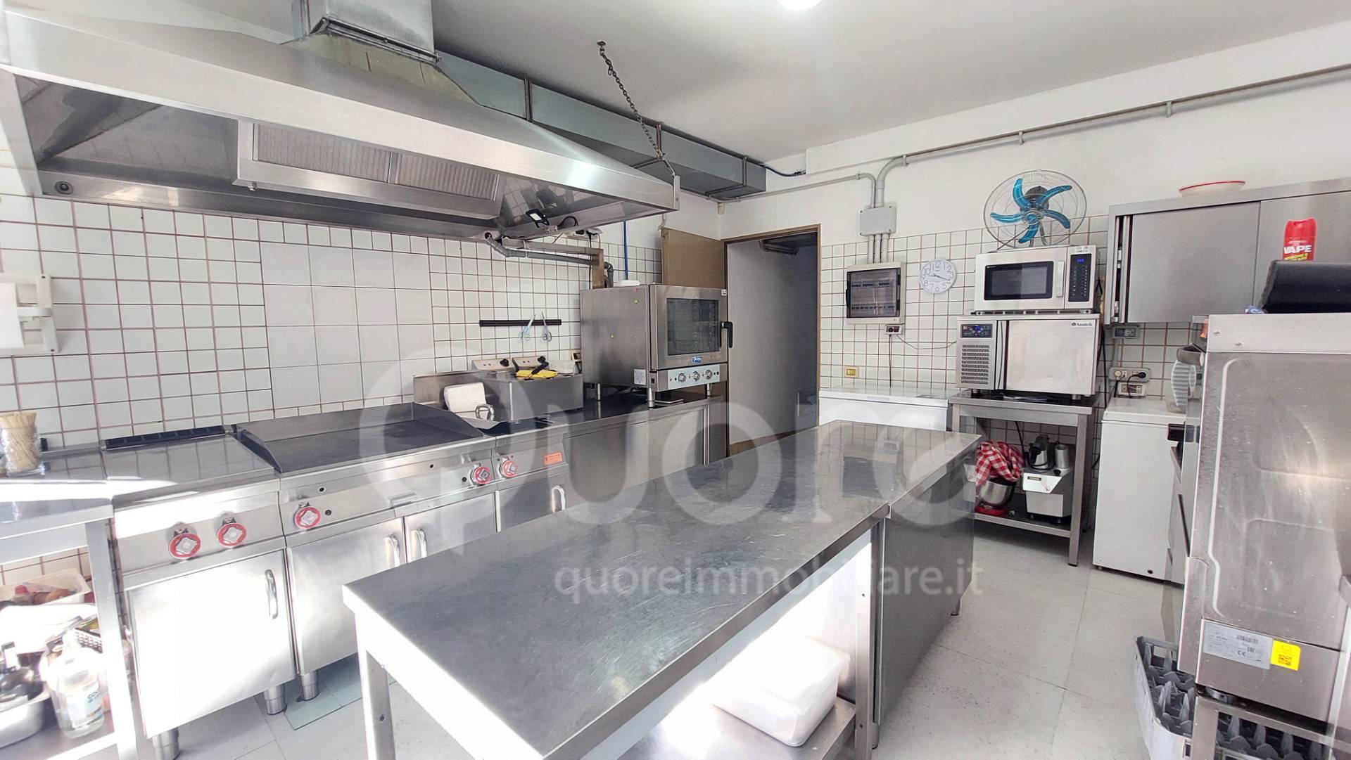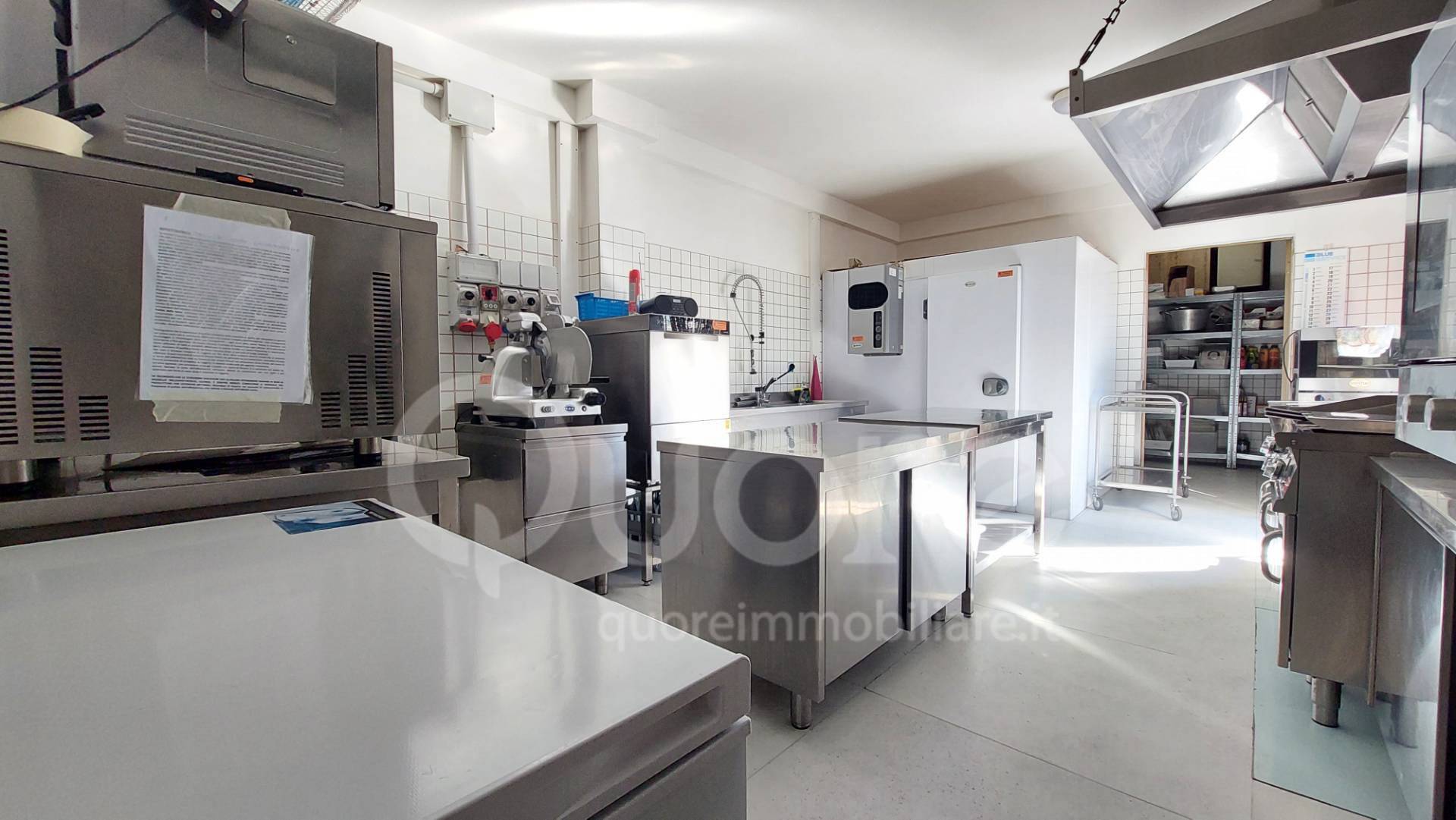 La cucina interna, a servizio delle due sale, è molto ben equipaggiata, con attrezzatura in acciaio inox, con accesso indipendente e recentemente ri-piastrellata, pronta all’uso per qualsiasi tipologia di servizio. Ospita anche due celle positive, due magazzini e prese da 220 e 380 V.