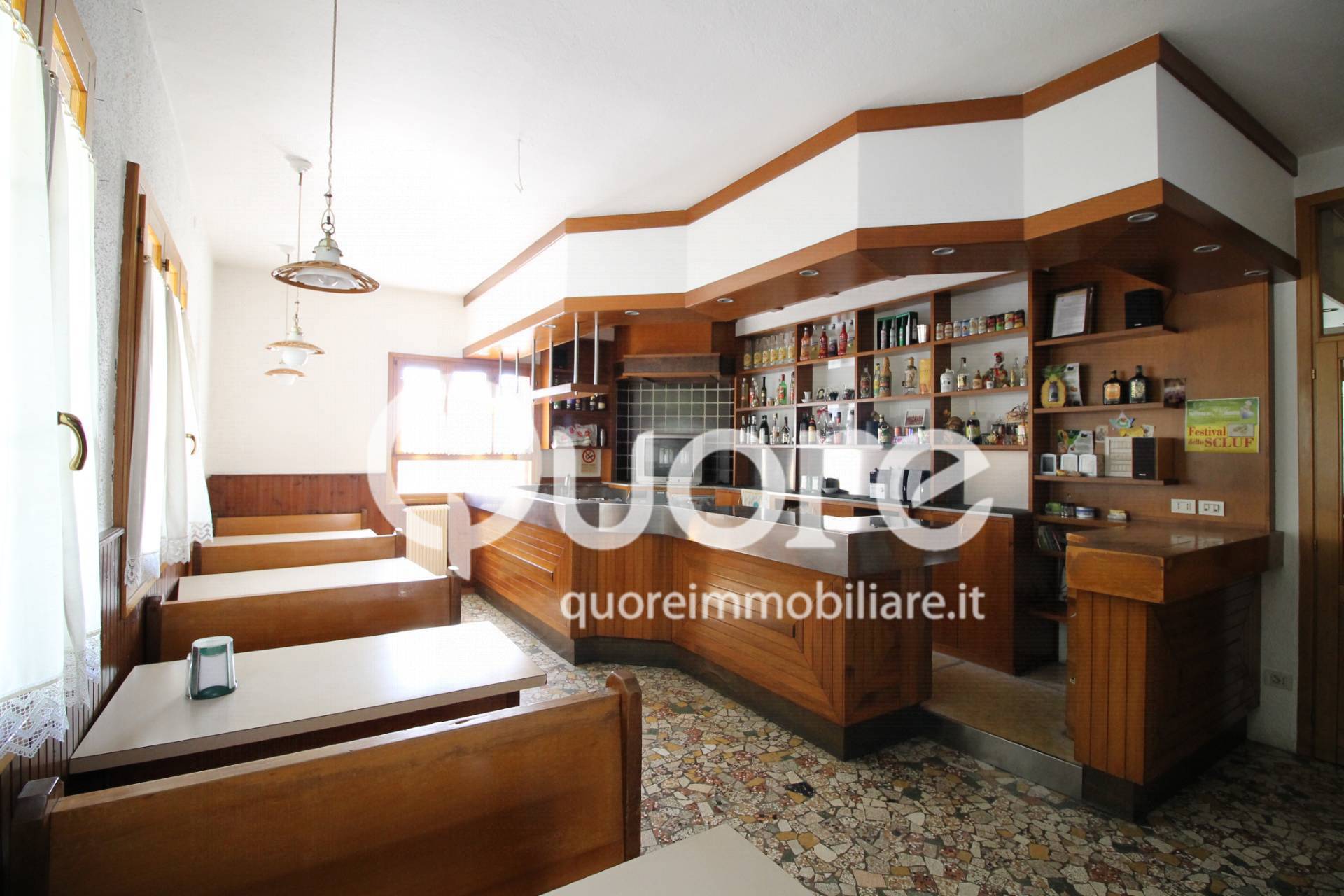 All’ingresso del locale troviamo la sala bar attrezzata e salone ristorante con doppi servizi e cucina, dal salone si accede ad un’ampia terrazza con vista sul tagliamento.