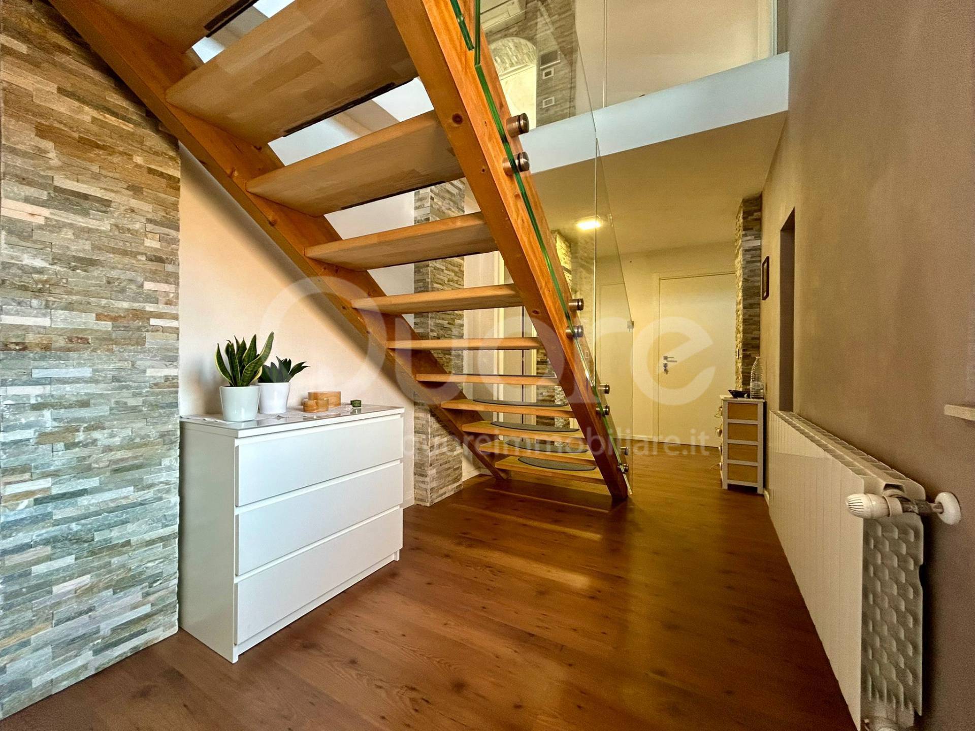 Una bellissima scala in legno collega i due piani e diventa un vero elemento d’arredo, accompagnando con eleganza verso il livello superiore.