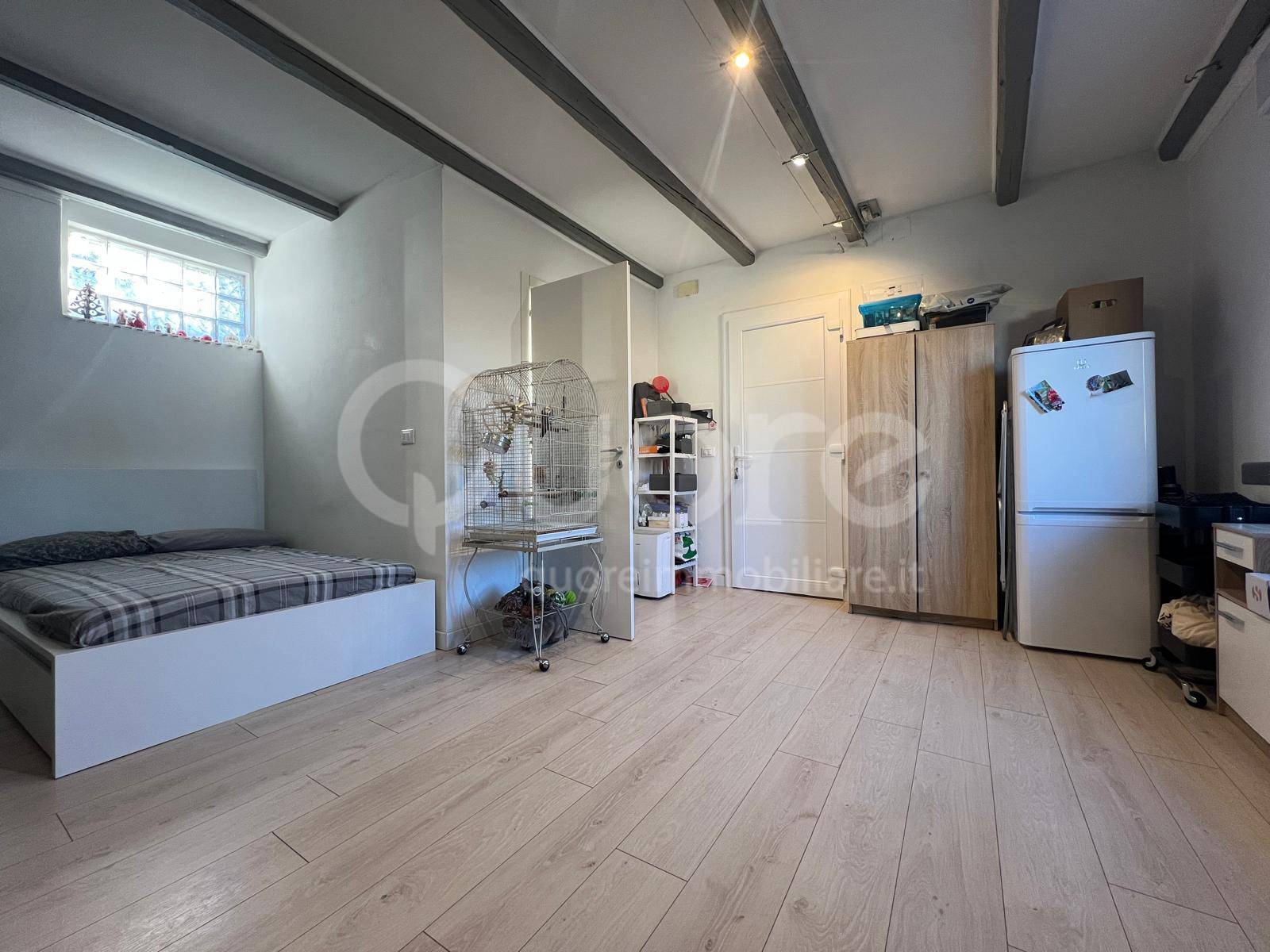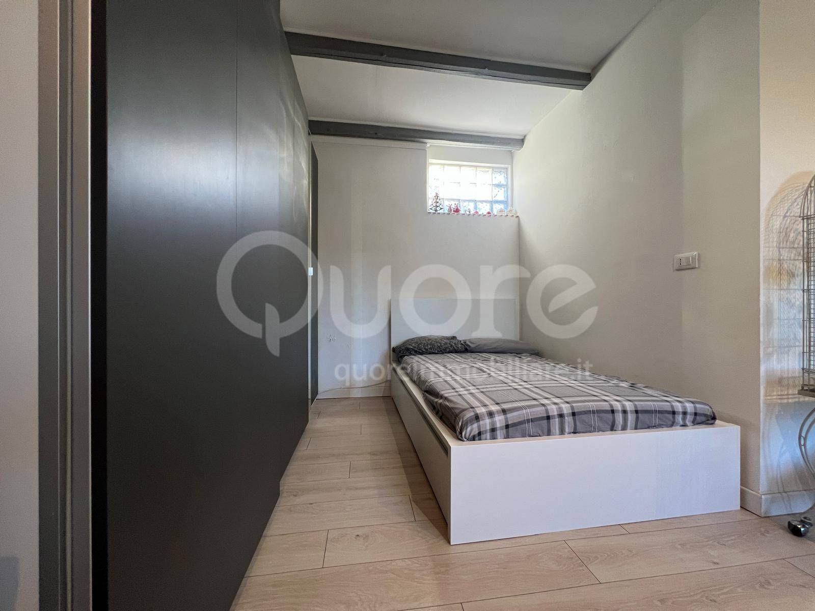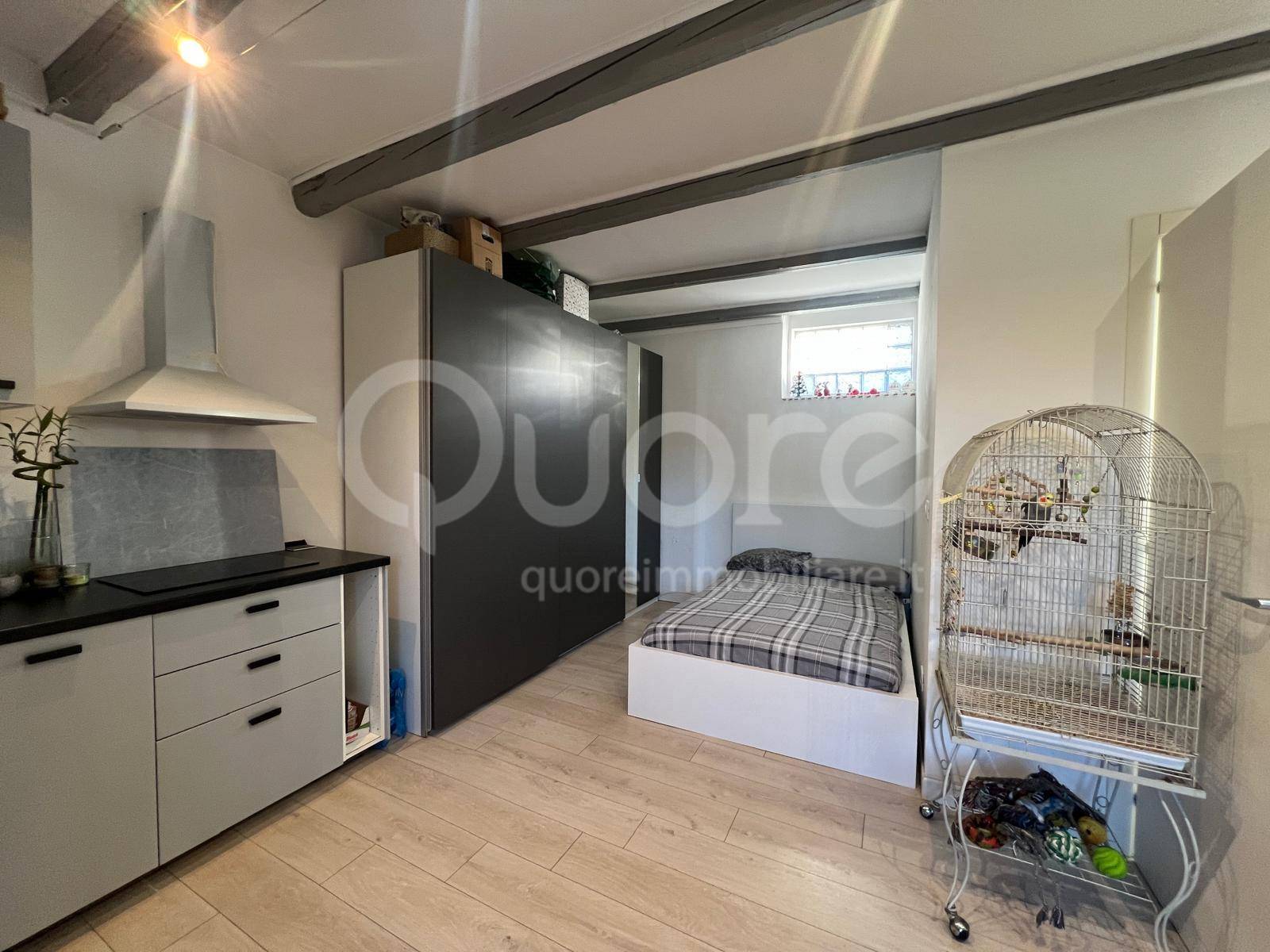La zona notte adiacente, completa di letto e armadiatura su misura, garantisce un angolo di relax intimo e confortevole. Il bagno, finestrato e spazioso, con doccia, completa l’abitazione con stile e funzionalità.
