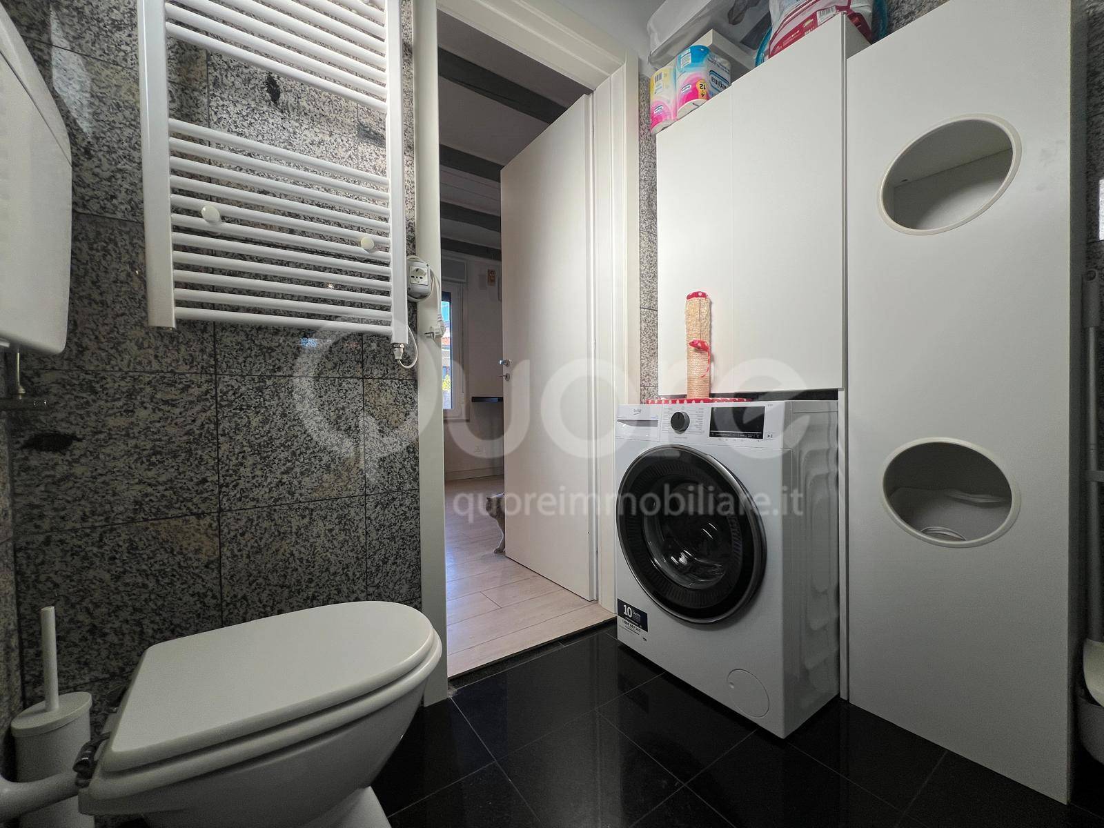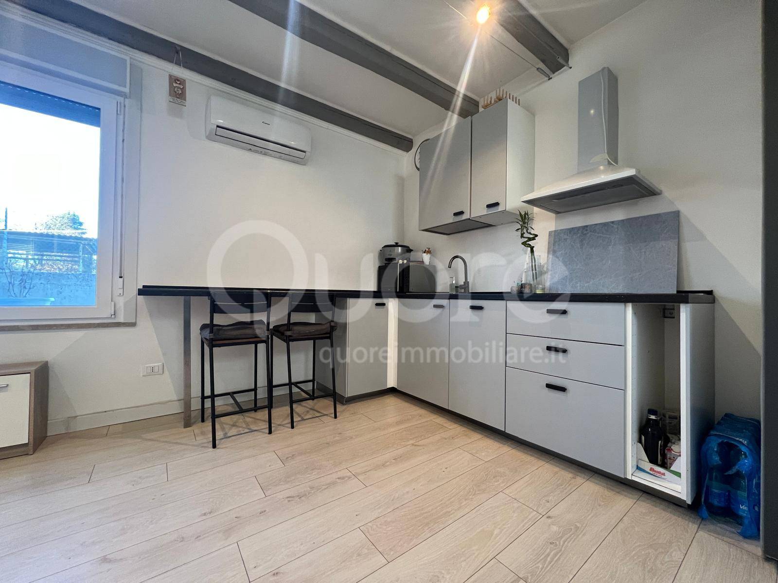 Varcando l’ingresso, si apre un ambiente luminoso con angolo cottura moderno e completamente attrezzato, perfetto per chi ama cucinare senza rinunciare alla praticità, e un’area dedicata ai pasti.