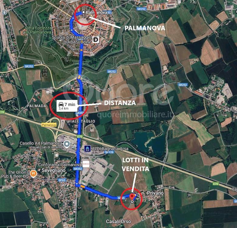 La posizione è strategica: a metà strada tra Udine e Grado, a soli 3 km da Palmanova e a breve distanza dal casello autostradale A4 di Palmanova (1,5 km) e dalla zona commerciale.