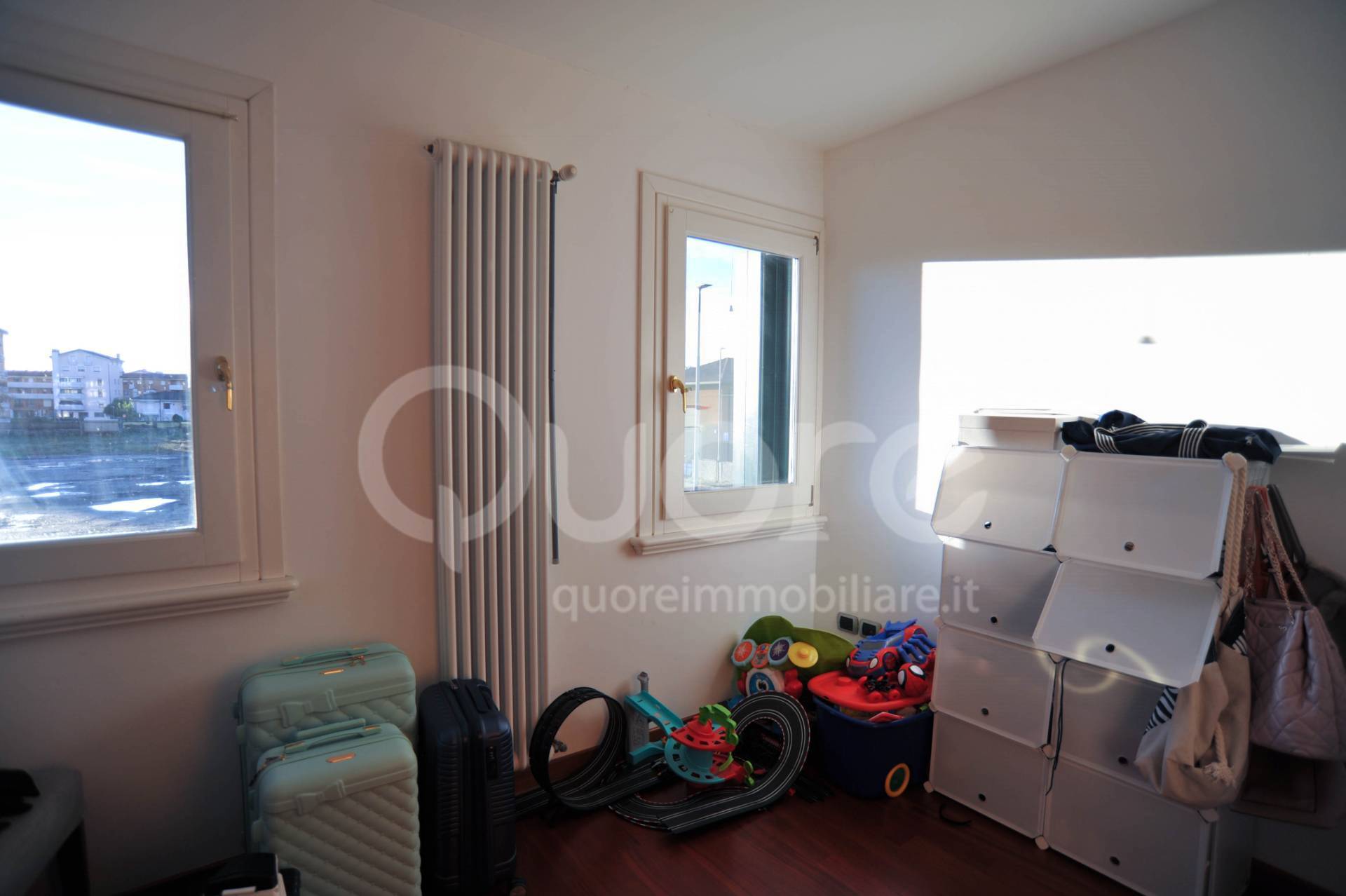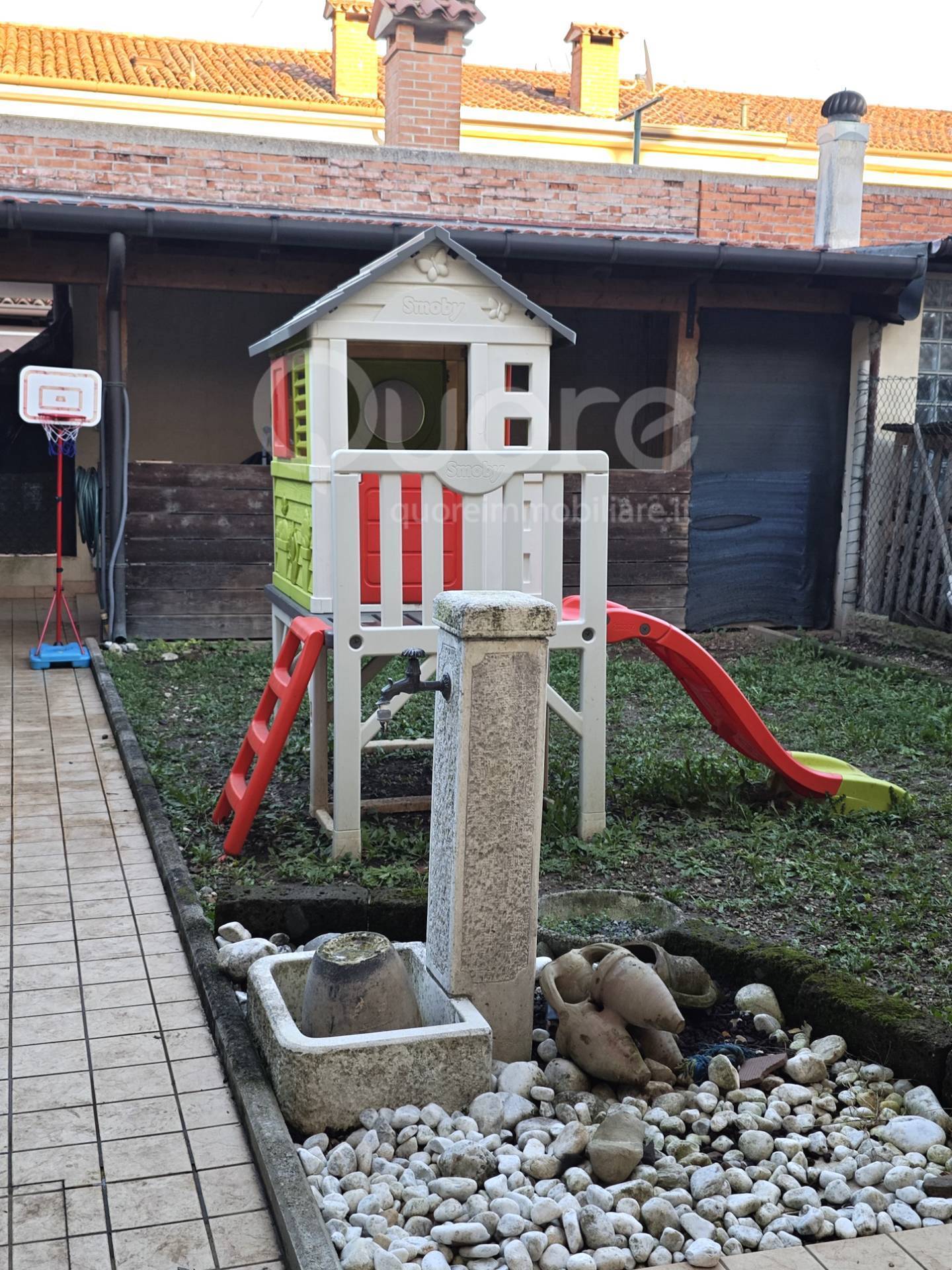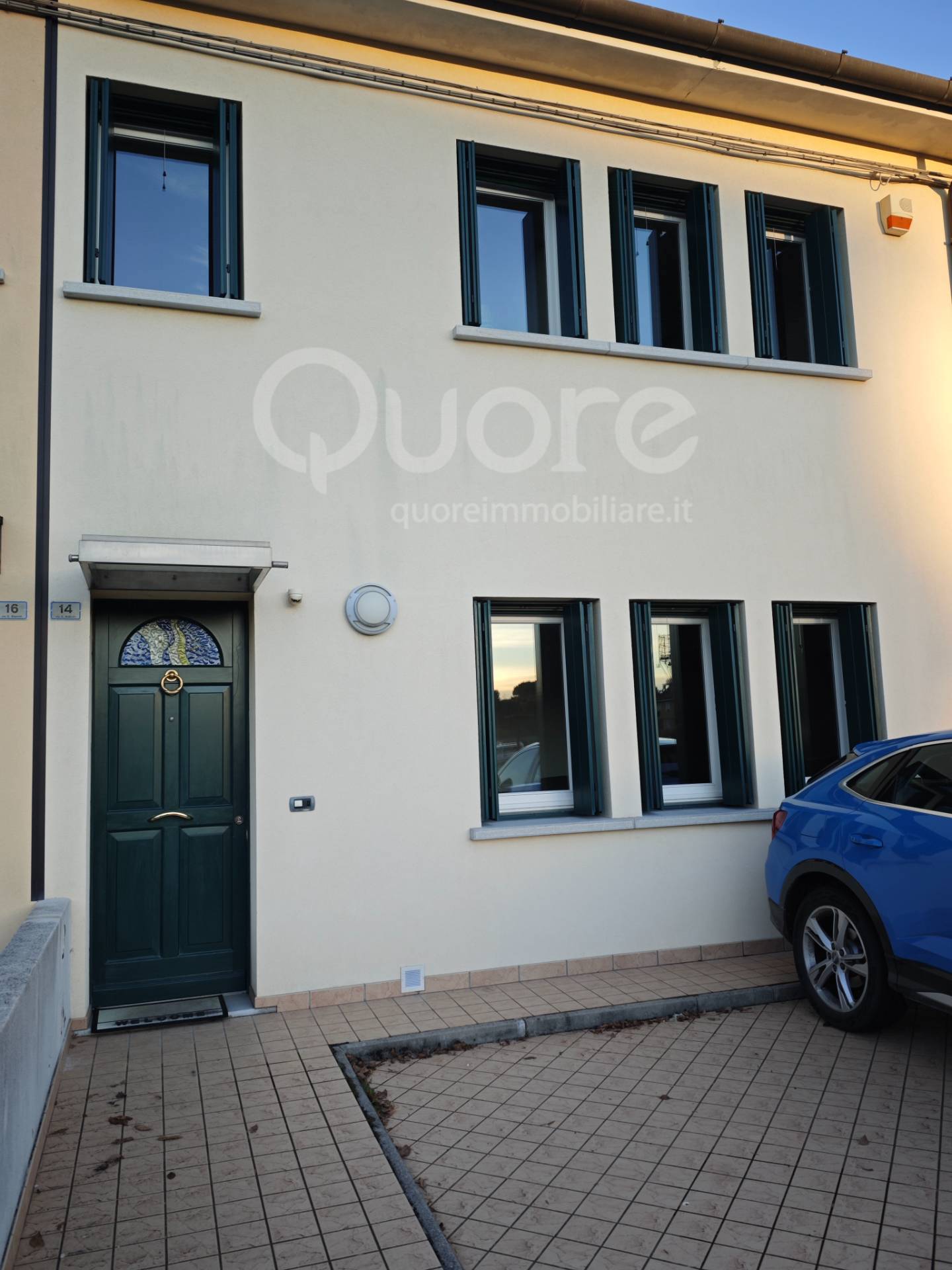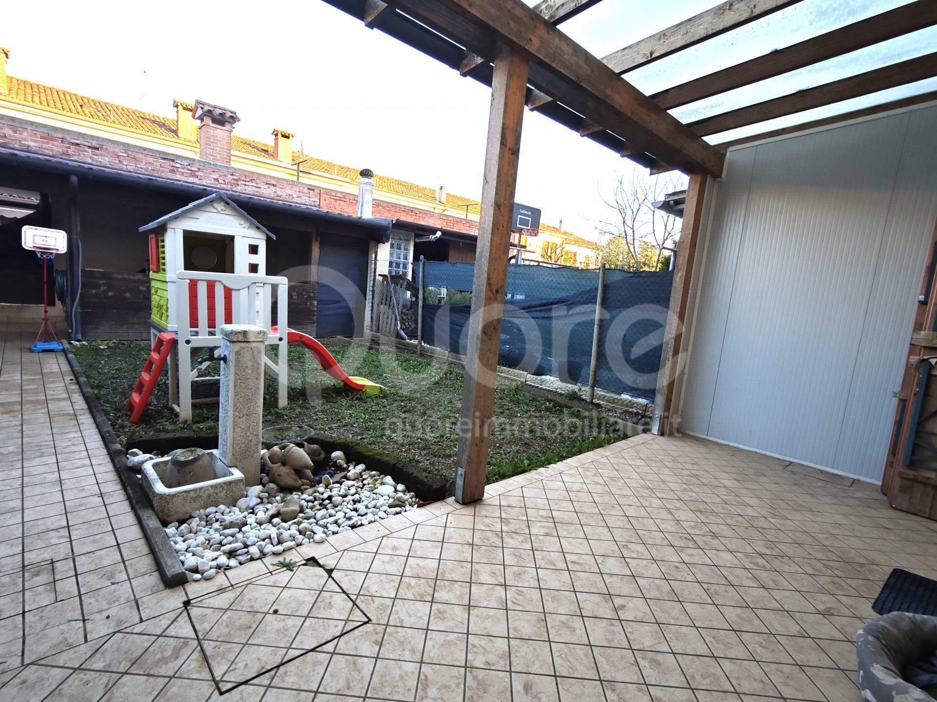 A due passi dal centro, villetta in linea del 2002, disposta su due livelli, oltre a due posti auto scoperti sul fronte della casa, giardino con annesso ripostiglio. Piano terra: soggiorno, cucina abitabile e bagno lavanderia; primo piano: tre stanze e bagno con doccia finestrato. Possibilità di ingresso pedonale anche da strada adiacente e fronte parco giochi. Superfici: piano terra mq 56, piano primo mq 56, posti auto mq 30, giardino mq 52, ripostiglio mq 10. Note: piano terra con riscaldamento a pavimento
