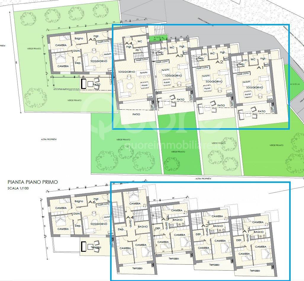 Ogni unità dispone inoltre di posti auto scoperti riservati e garage al piano interrato, a completamento di una soluzione abitativa completa e funzionale.